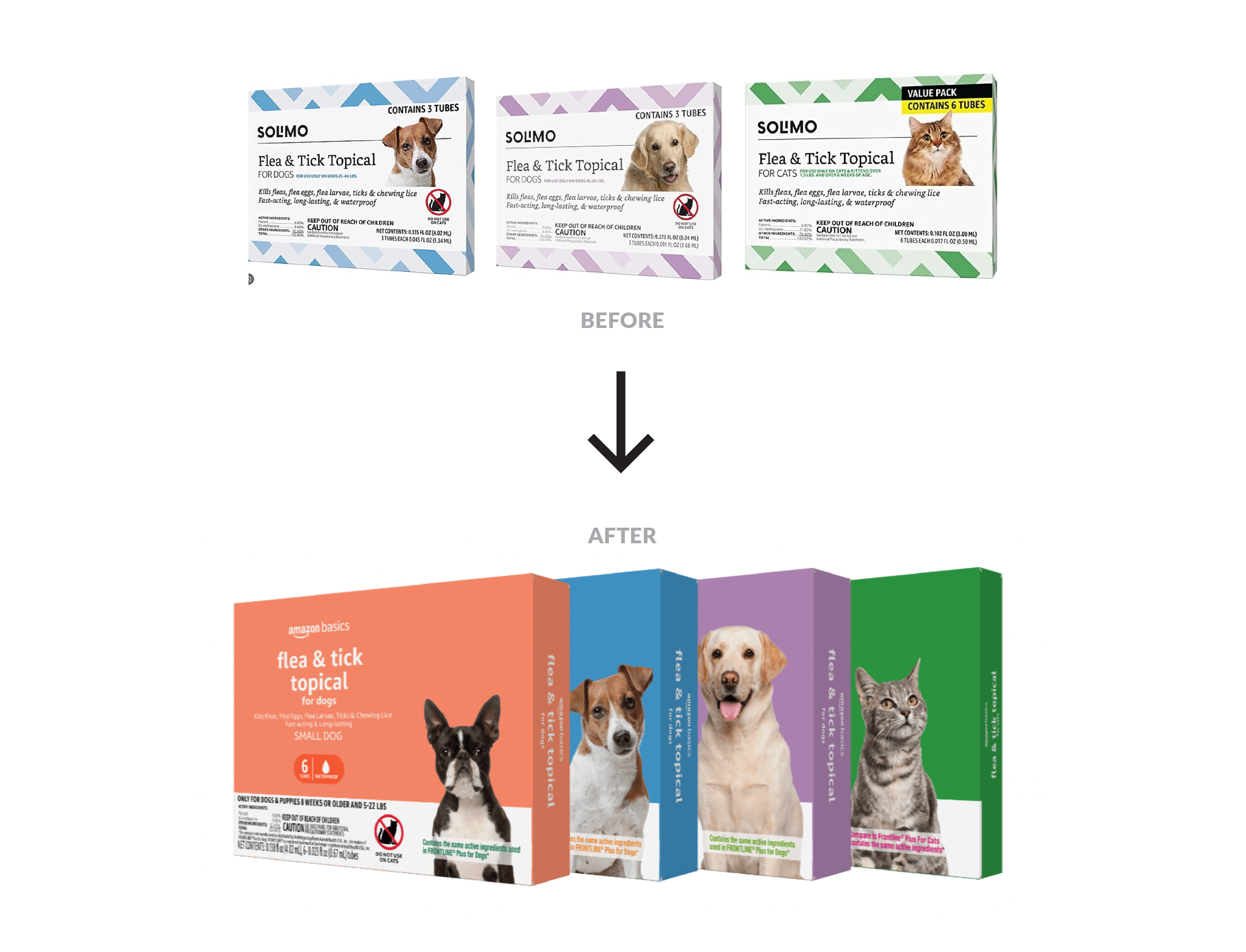 My redesigned Amazon Basics packaging became bestsellers, with flea & tick cat SKU at 10K+ sales/month, flea & tick medium and large weight dog SKU’s at 6K+ sales/month, other dog weights averaging 3K+ sales/month.